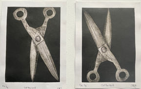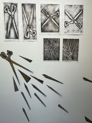 The theme of Scissors slowly emerged from my first-term work and gradually developed into a consuming project. Everything about scissors is double-edged, being both creative and destructive. As Jordan Peele, writer of the psychological horror film Us (2019), observes: "There is a duality to scissors, a whole made up of two parts that lie in the territory between the mundane and the absolutely terrifying." Scissors as a symbol in art offer a range of concepts including precision, severance, the fates, creation, and the space between life and death. During this project, I have tried to capture both the action and the ethos of scissors—their capacity to simultaneously make and unmake.